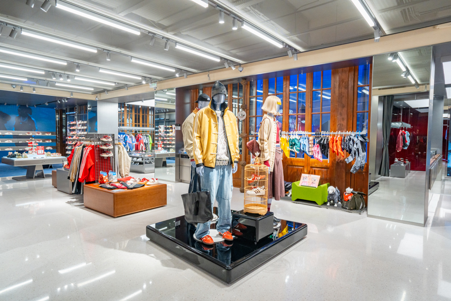 而店内特别打造的“三叶草宠物系列”专属体验区也尤为引人注意。这一区域设计与石库门建筑中标志性的天井庭院空间完美融合,将人宠之间的亲密情感联结,通过家庭式庭院的穿搭与生活场景进行具象化演绎,为消费者提供了温馨且独具格调的零售新体验。